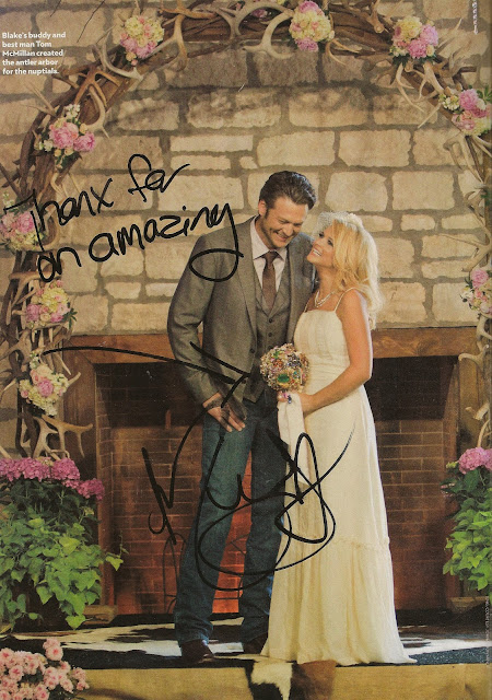 When Miranda Lambert came to town to perform at Nationwide Arena in June 2012, we bought our tickets right away. When I mentioned to her mom, Bev, that we were excited to see her perform, she told me that Miranda would love to meet me & Jason! Last May, as I created her brooch bouquet for her wedding to country heartthrob Blake Shelton, the whole thing happened in the blink of an eye- I was hired to create the bouquet a week and a half before the big day, I received her heirloom pieces about a week out, and I had to burn a sick day to complete the bouquet and get it back to Texas in time. People asked if I got to meet Miranda. Until last week I considered myself lucky to have had a phone conversation with Bev during Ran's bachelorette party weekend, while I asked questions about the details of the bouquet and Miranda answered them in the background.
