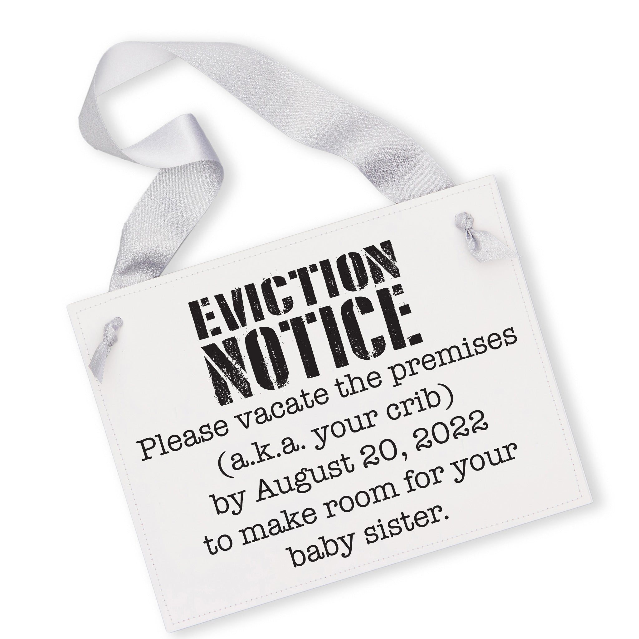 This eviction notice sign turns your little one into the star of your pregnancy announcement. Hang it on the crib to share the news that a new baby is on the way—and a big brother or sister room is coming soon. Sweet, funny, and made to capture that perfect pouty face moment.