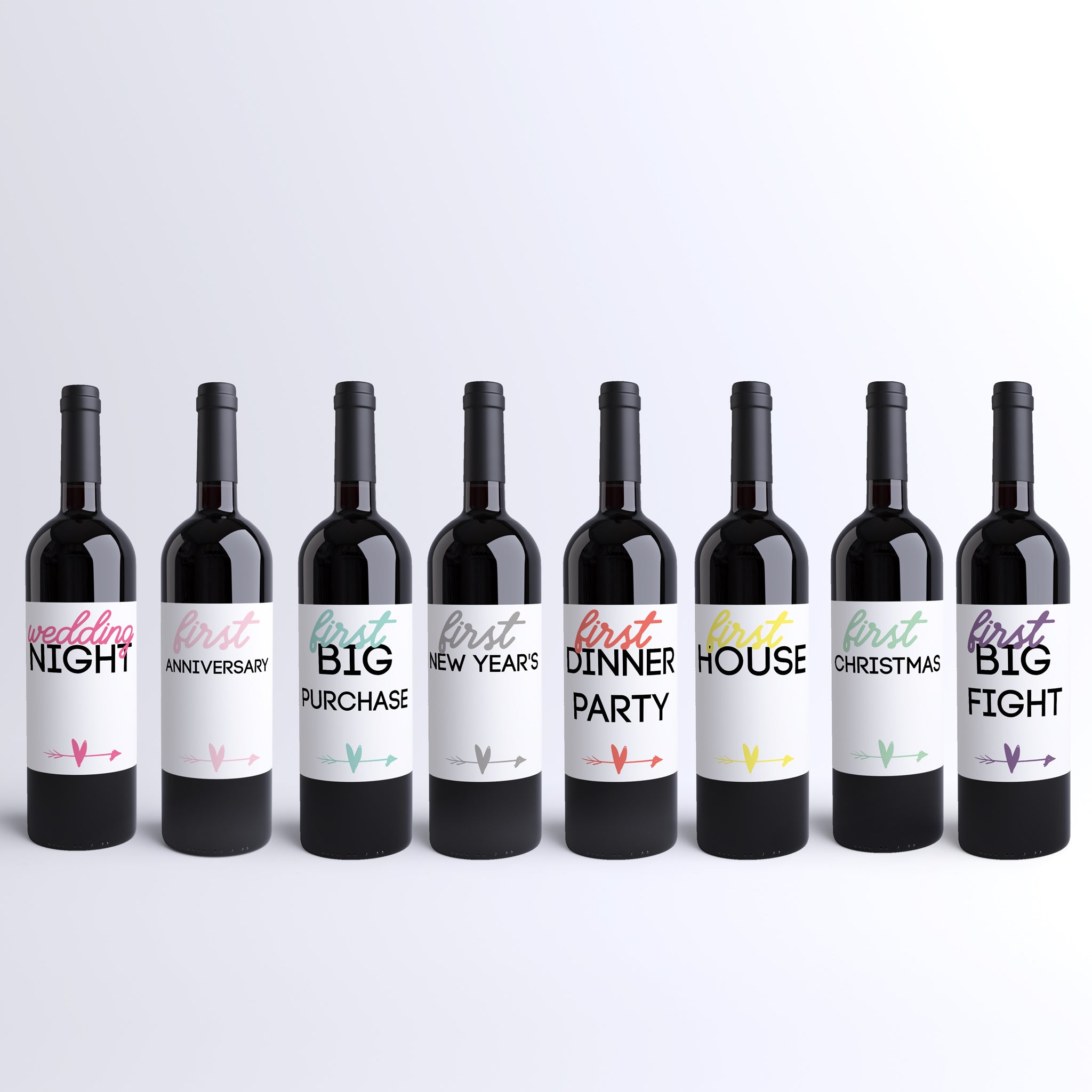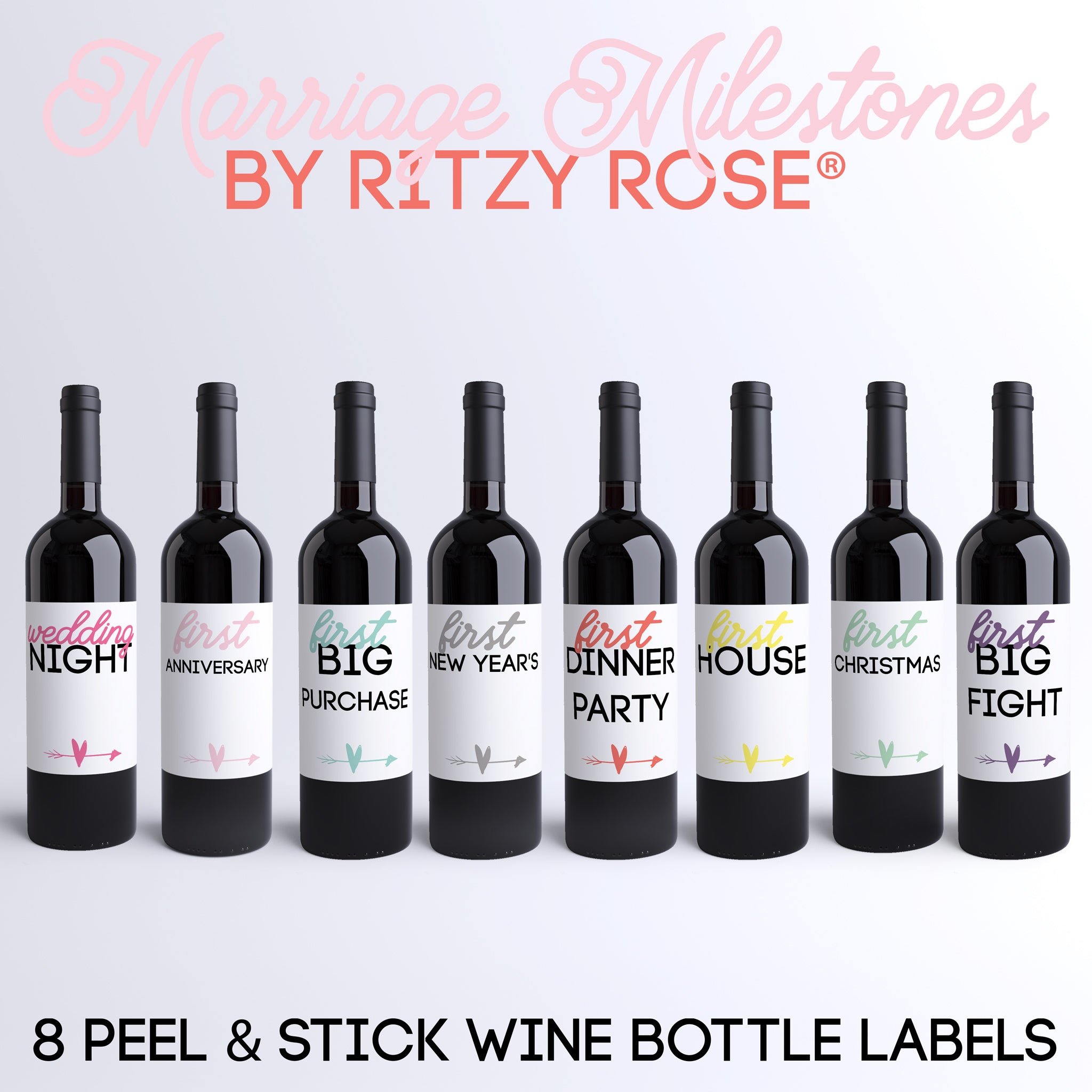 Marriage milestone wine labels make each anniversary feel special. This set of 8 covers the early years with a clean, modern look that fits any style. A thoughtful gift for newlyweds to open year after year.