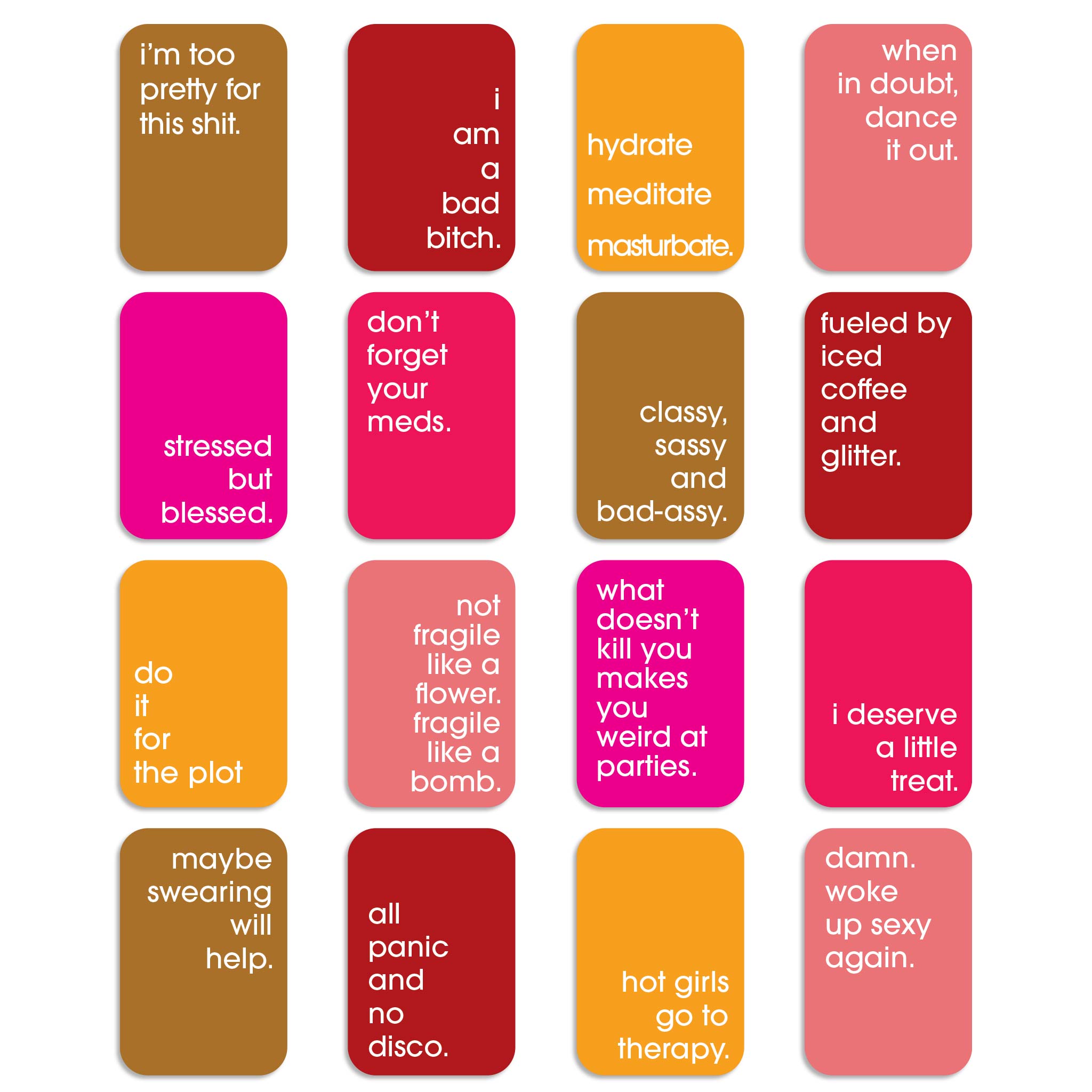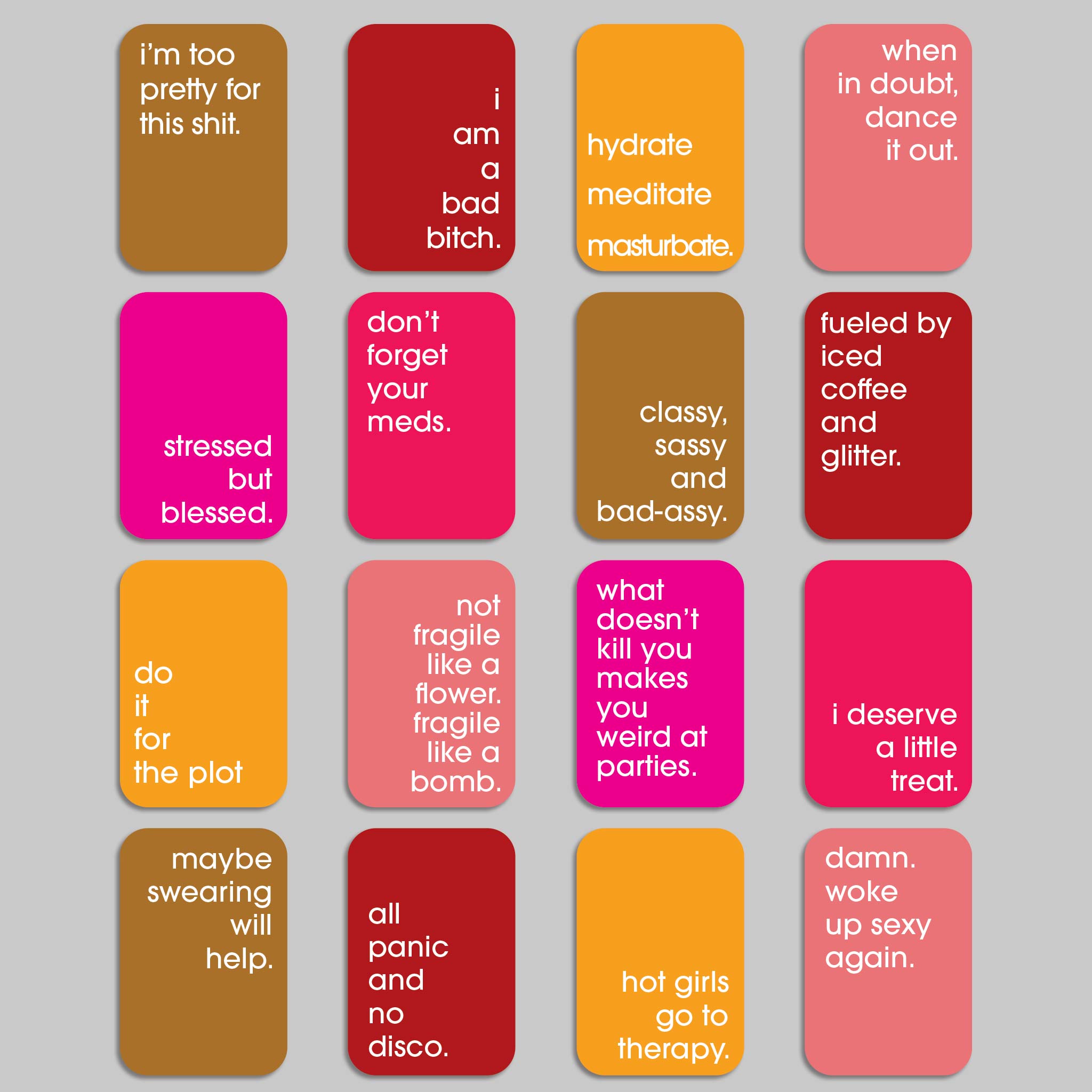 Sassy affirmation cards that feel like a pep talk from your boldest friend. Perfect for the woman who needs a daily dose of humor with her self-care—on her desk, her mirror, or tucked in a gift bag. A fun, cheeky reminder to hydrate, meditate, and stop being so hard on yourself.