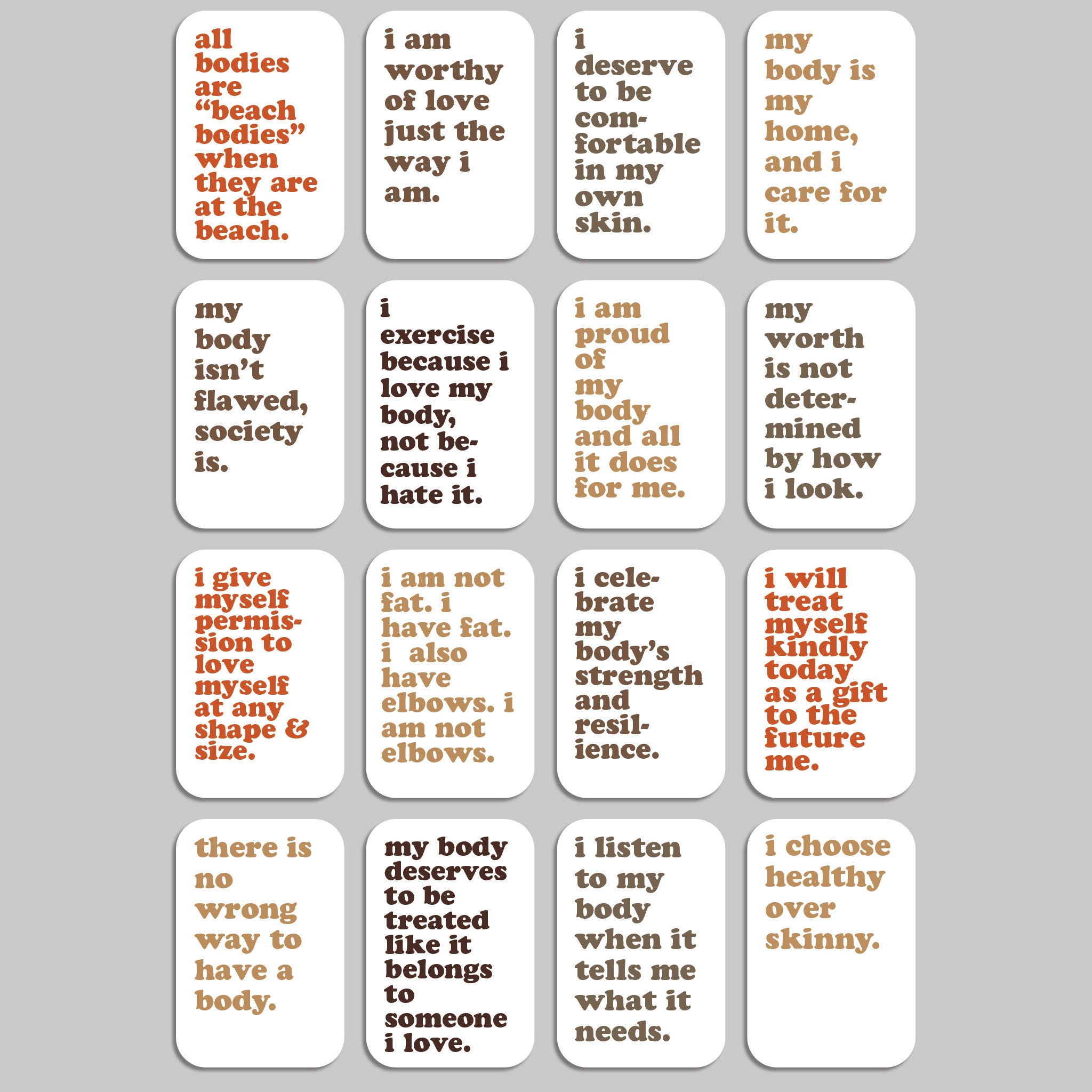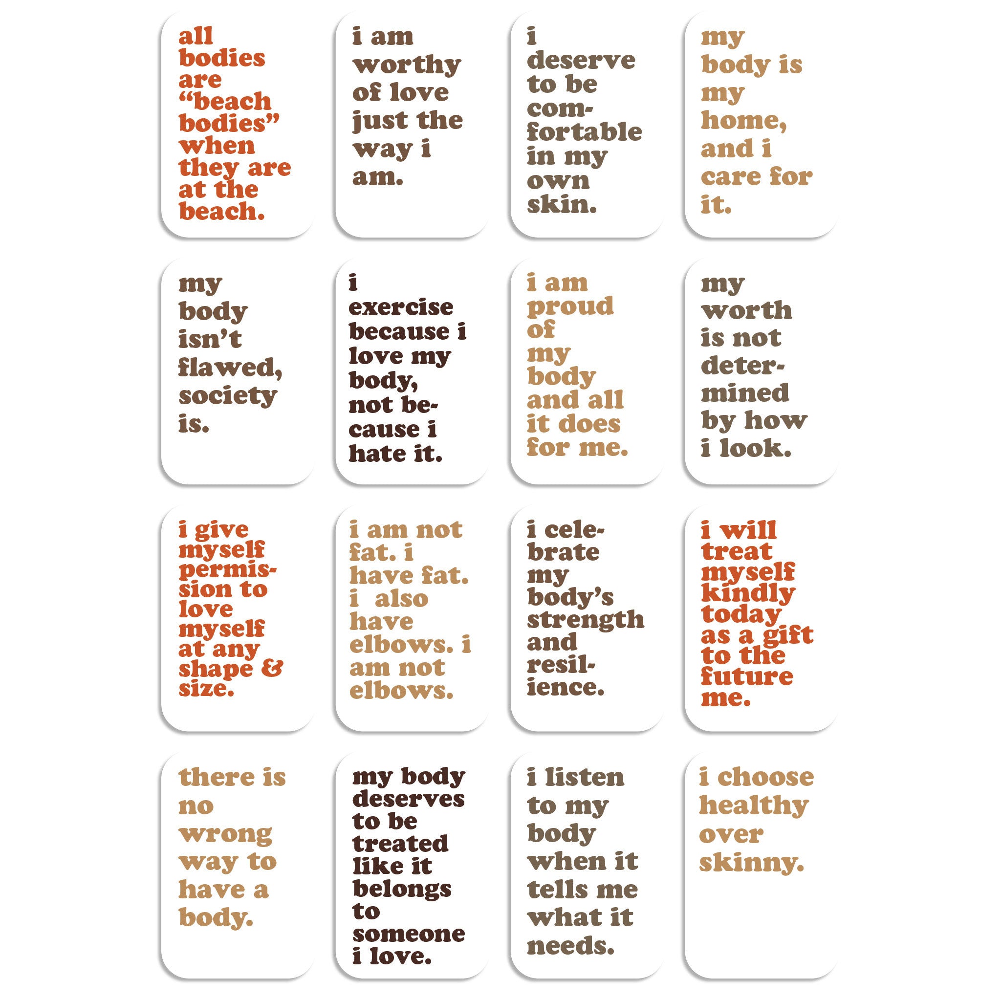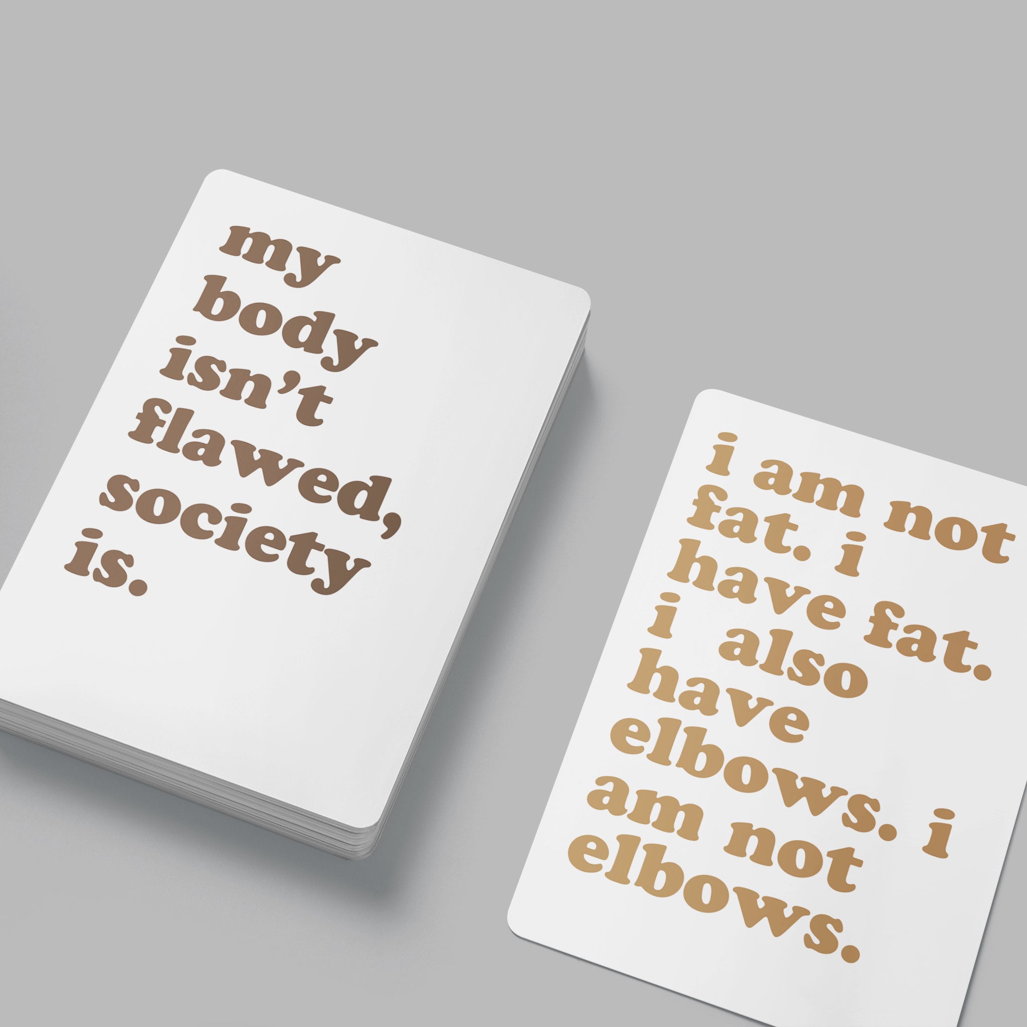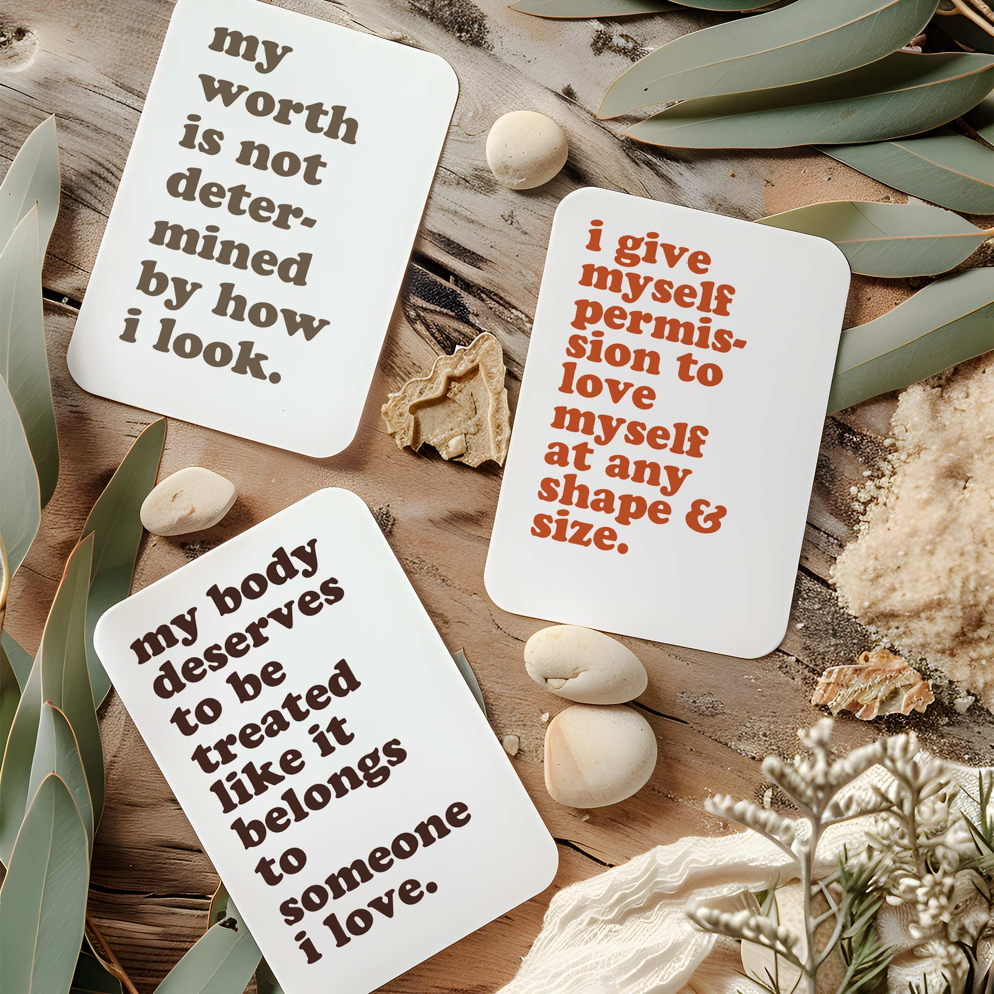 Body positive affirmation cards for women who need a gentle nudge back to self-love. This 16-card deck speaks to the hard days—recovery, doubt, learning to feel at home in your own skin. Keep them close, pull one when you need it, or gift them to someone fighting their way back to themselves.