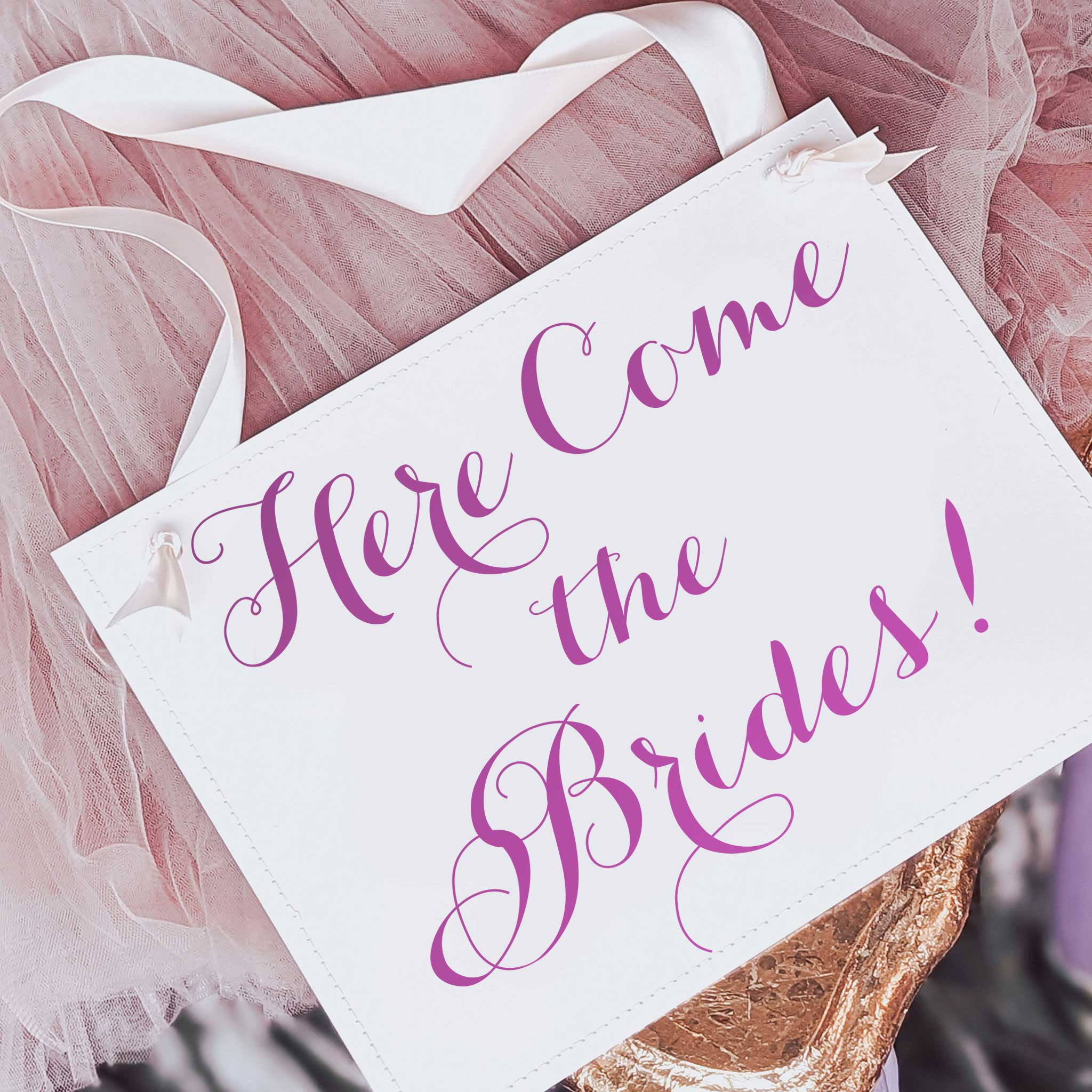 Here Comes the Brides wedding sign — because it’s brides, plural, and that matters. This piece is about celebrating two women choosing each other, standing tall in a moment that used to leave so many unseen. We create it to boldly announce love that is mutual, powerful, and fully worthy of being celebrated out loud.